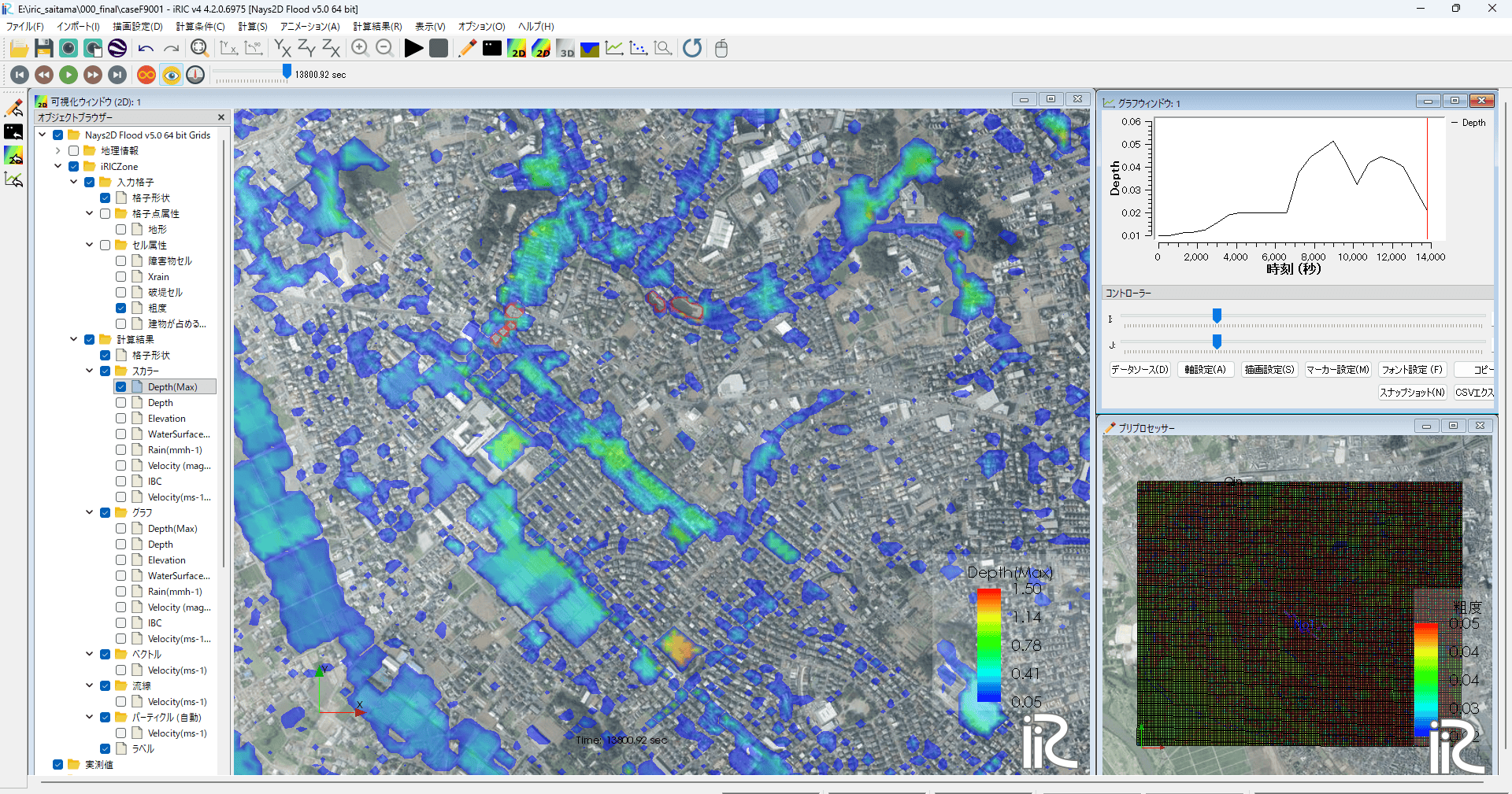 内水氾濫シミュレーションの中核となる計算エンジンには、河川流況および氾濫解析分野において国際的に広く利用されているiRICのソルバーであるNays2D Floodを採用し、平面二次元不定流解析を実施した。iRICはオープンソースソフトウェアとして公開されており、国土交通省が示す「小規模河川の洪水浸水想定区域図作成の手引き (令和 5 年7月 国土交通省水管理・国土保全局 河川環境課 水防企画室・国土技術政策総合研究所 河川研究部 水害研究室)」においても標準的な解析手法の一つとして位置付けられていることから、防災・減災分野において高い信頼性と豊富な実績を有する解析基盤である。