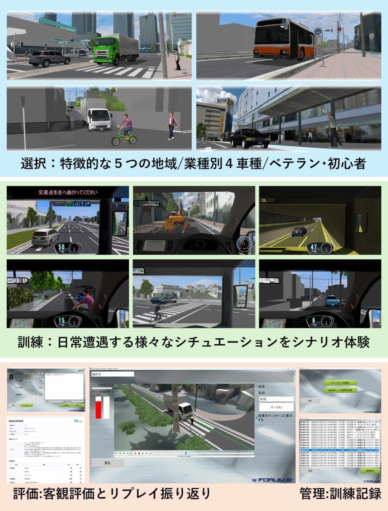 大型トラック・バス・タクシーなど、車種ごとの操作感や死角といった物理特性を忠実にシミュレートする。さらに、初心者向けの基本操作習熟から、ベテラン向けの危険予測訓練(ヒヤリハット再現)まで、ドライバーの経験レベルや教育目的に応じた多様なシナリオを設計・提供する。
