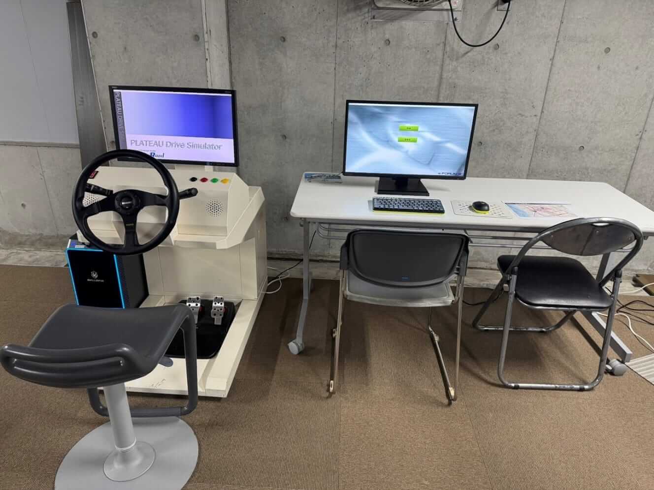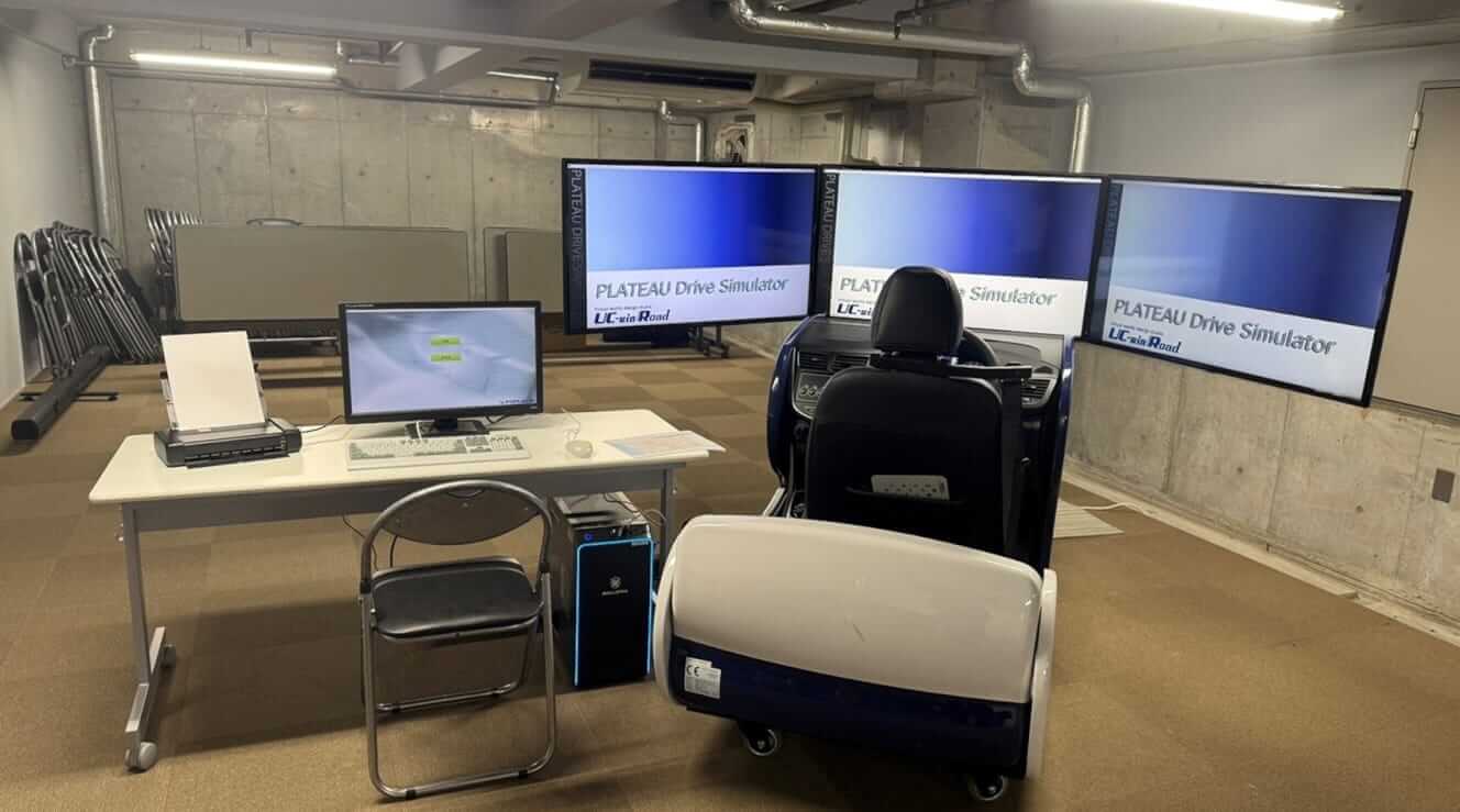 本システムは、自社開発の3DリアルタイムVRプラットフォーム「UC-win/Road」を基盤に採用した。G空間情報センターが公開するCityGML形式の3D都市モデルの該当するジオメトリ情報、建築物(LOD1/2)、都市設備(LOD3)、橋梁(LOD2)等を直接取り込むことで、ドライブシミュレータの走行ルートとなる都市骨格をデジタルツインとして忠実に再現。さらに、CSV形式等の交通センサスや自治体提供の人流データを統合することで、現実世界と遜色のない訓練用デジタルツイン空間を動的に生成する。この仮想空間内では、複数のシミュレーションエンジンがリアルタイムに連携して動作する。自車の挙動を再現する「運転シミュレーション」、周囲の車両動態を制御する「交通シミュレーション」、および歩行者の不規則な動きを再現する「人流シミュレーション」が相互に影響し合うことで、従来のドライブシミュレータが搭載している静的な3Dモデルだけでは再現が困難な、動的かつ複雑な交通環境を構築している。訓練者は、ステアリングやペダルを備えた専用のドライブシミュレータを通じて、この高度に可視化された空間内で運転を行う。実車に近い物理的な操作感と、現実の走行ルートを反映した視覚情報を組み合わせることで、仮想空間内での経験を実社会での運転技能へと直結させるインターフェースを実現している。これにより、実車では危険を伴うためトレーニング内に組み込むことが困難な状況下での実践的な運転訓練や、客観的データに基づく運転技能評価を可能とした。