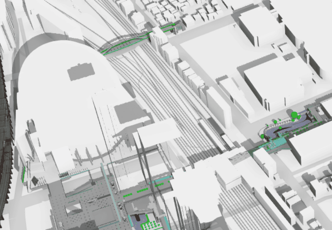 本プロジェクトでは、3D都市モデル(建築物LOD2、道路LOD2、広場LOD3、橋梁モデル LOD2、都市設備モデル LOD3)を基幹データとして活用した。さいたま新都心エリアの建築物の形状や高さのみならず、道路の微細な形状や地形を含む詳細な地理空間情報を統合。これにより、ロビーエリア内において、プレイヤーが実在の都市空間を自在に探索できる、極めて高度な再現性を具現化した。