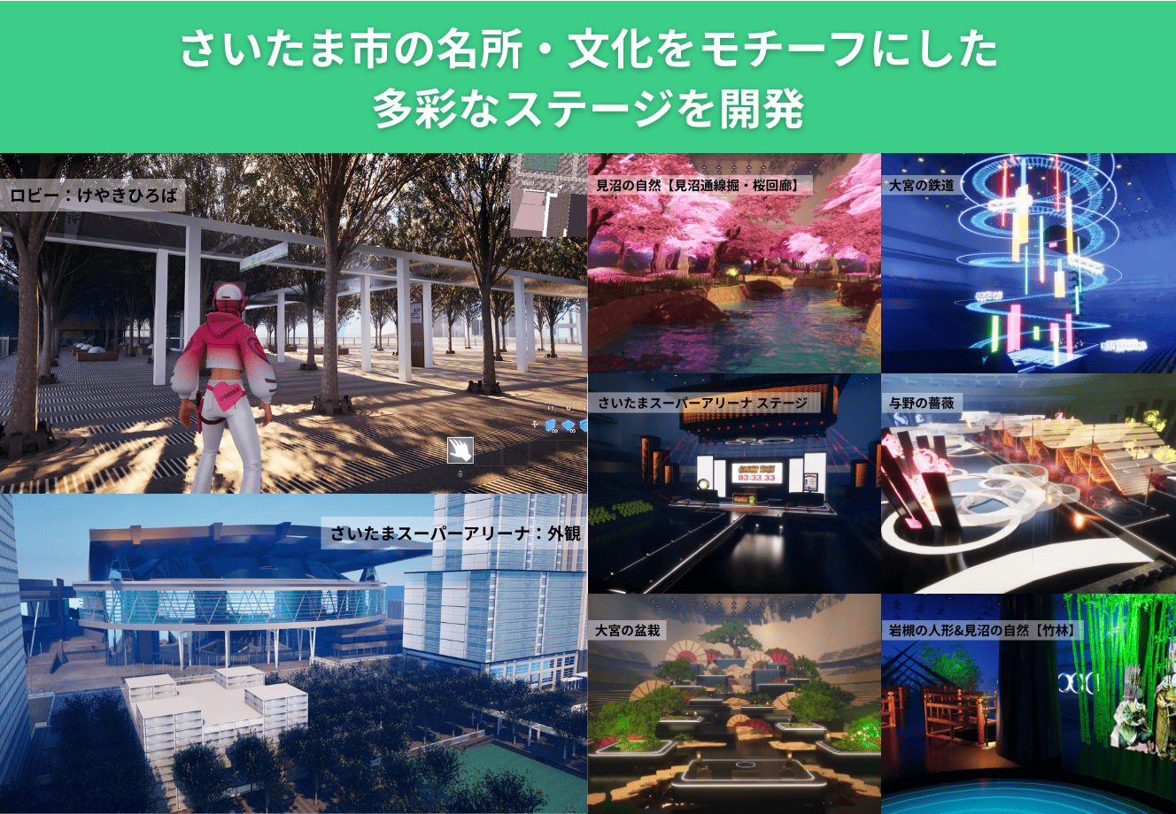 開発したコンテンツのロビーエリアにおいては、3D都市モデルのジオメトリに高精細テクスチャを重畳し、実証地である「さいたま新都心エリア」を仮想空間上に高精度に再現した。これにより、利用者が自由な回遊・探索を行える、実地に近い都市環境を具現化している。また、タイムトライアルの6ステージにおいては、さいたま市の名所や文化をモチーフとした走行コースを構築した。各コース内には、実在する建造物や名産品等を精緻に配置・再現し、本市の魅力を効果的に発信する構成とした。