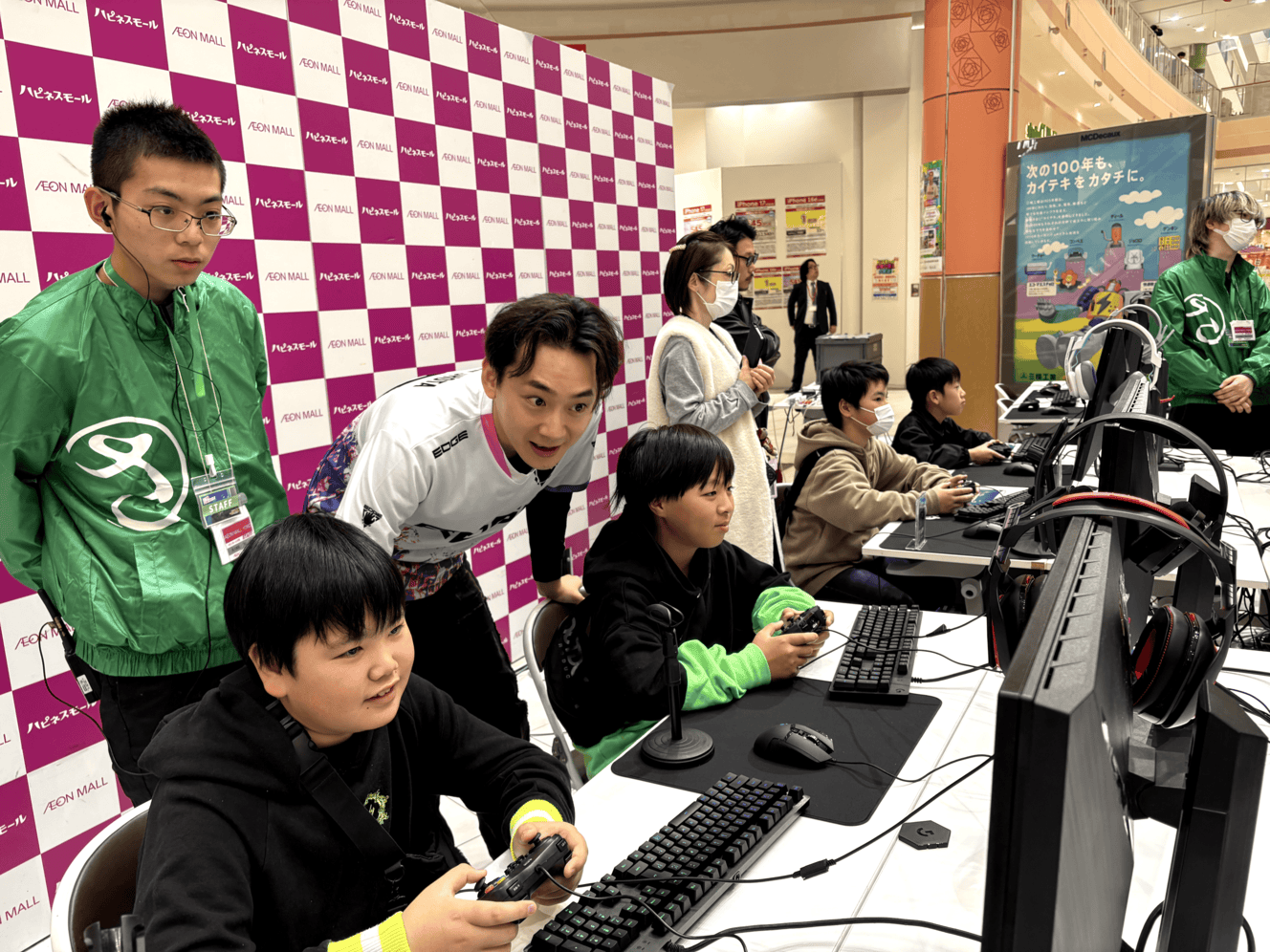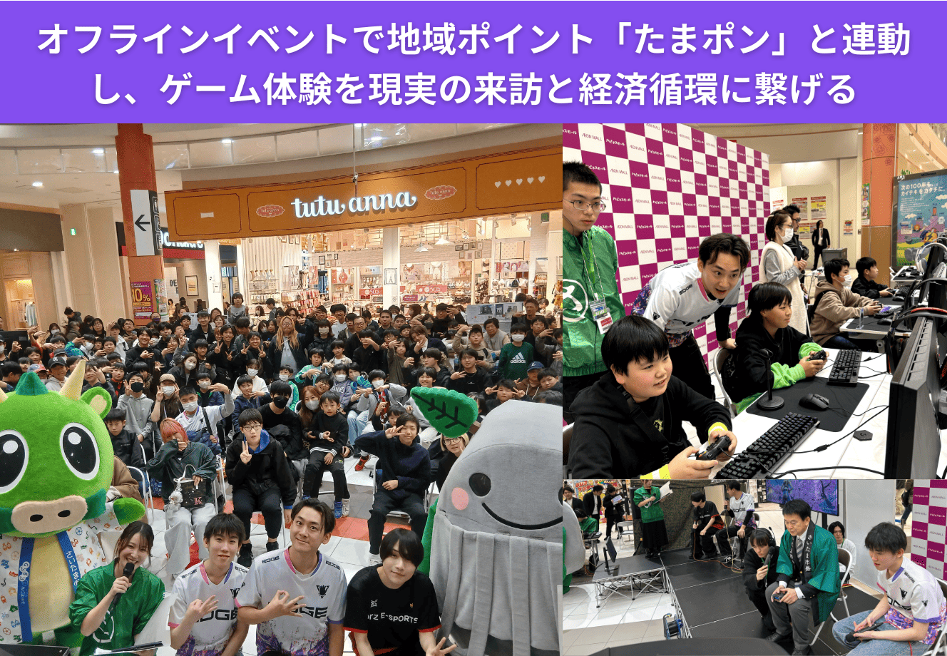 2025年12月14日、イオンモール与野(さいたま市)にて実証イベントを実施した。イベントの魅力を最大化し、情報の広域拡散を図るため、人気プロゲーマーやインフルエンサーをゲストとして招聘。会場内では、来場者が自由にゲームを体験できる試遊エリアのほか、ゲストと参加者が交流するステージプログラム、および上位入賞者を決定するミニ大会を企画・運営した。
