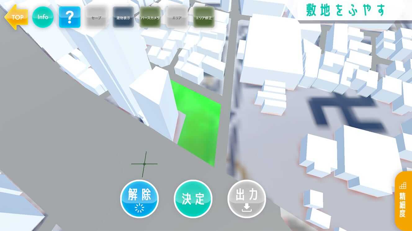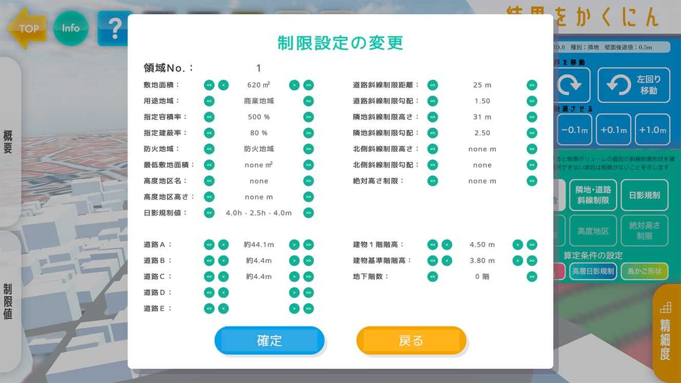 敷地条件の調整・設定機能については、ユーザーの操作に従い、敷地形状を柔軟に設定できると共に、都市計画の適用条件の補正を行える機能を構築した。これにより、実際の敷地条件との整合を取れるアウトプットを算出可能とした。