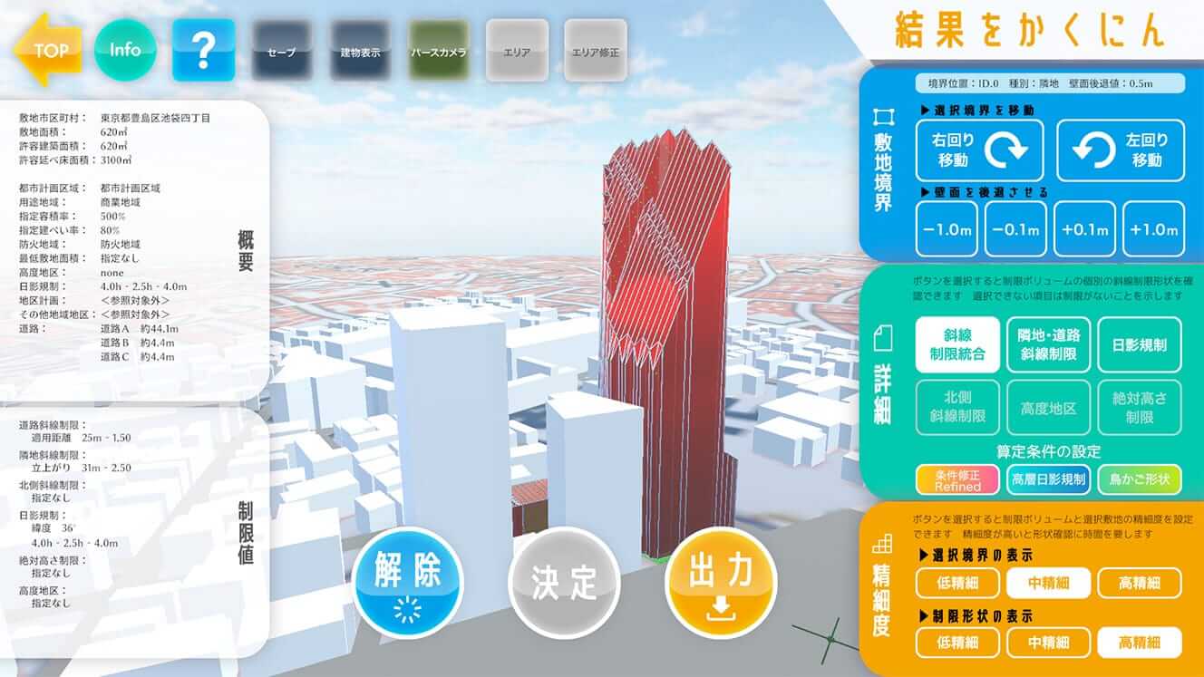 本プロジェクトでは、2024年度に開発した「3D都市モデルを利用した建築計画ボリューム検証出力サービス」をベースに、以下の機能を実装することで、東京都23区内での建築計画可能なボリューム検証サービスへ拡張した。