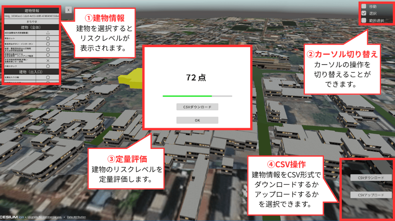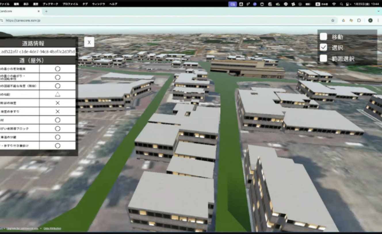 本プロジェクトでは、3D都市モデルのジオメトリを可視化基盤とし、建築物LOD2.2、建築物LOD1、道路LOD1、地形LOD1を活用して、建築物・道路・エリア単位の「福祉対応性」を定量評価・可視化するWebアプリケーション「CareScore」を開発した。