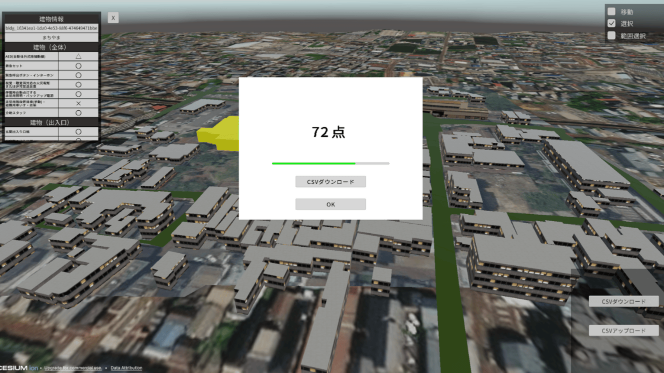 ユーザーは、ビューア上で評価対象となる建築物・道路・エリアを指定することで、即座に評価プロセスを開始できる。システム内部では、3D都市モデルの属性情報と独自に取得した屋内測定データが動的に統合・処理され、独自の「福祉対応性算出アルゴリズム」に基づき、環境の適応度を定量化する100点満点のスコアが算出される。