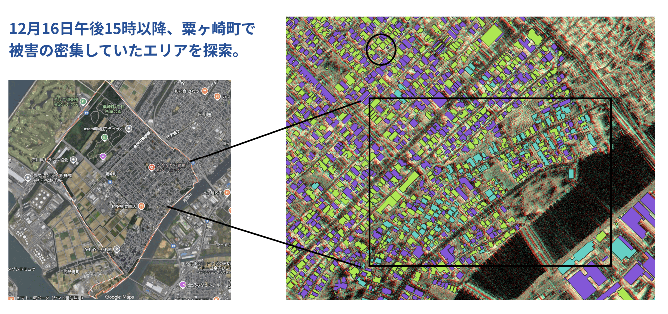 前者のアルゴリズム検証では、大型および小型SARのカバレッジ評価を通じた技術的な精度確認を行うとともに、想定ユーザーである5団体(金沢市の資産税課および危機管理課、民間ハウスメーカー3社)の担当者を対象としたアンケートとヒアリングを実施し、解析結果の有用性を検証した。