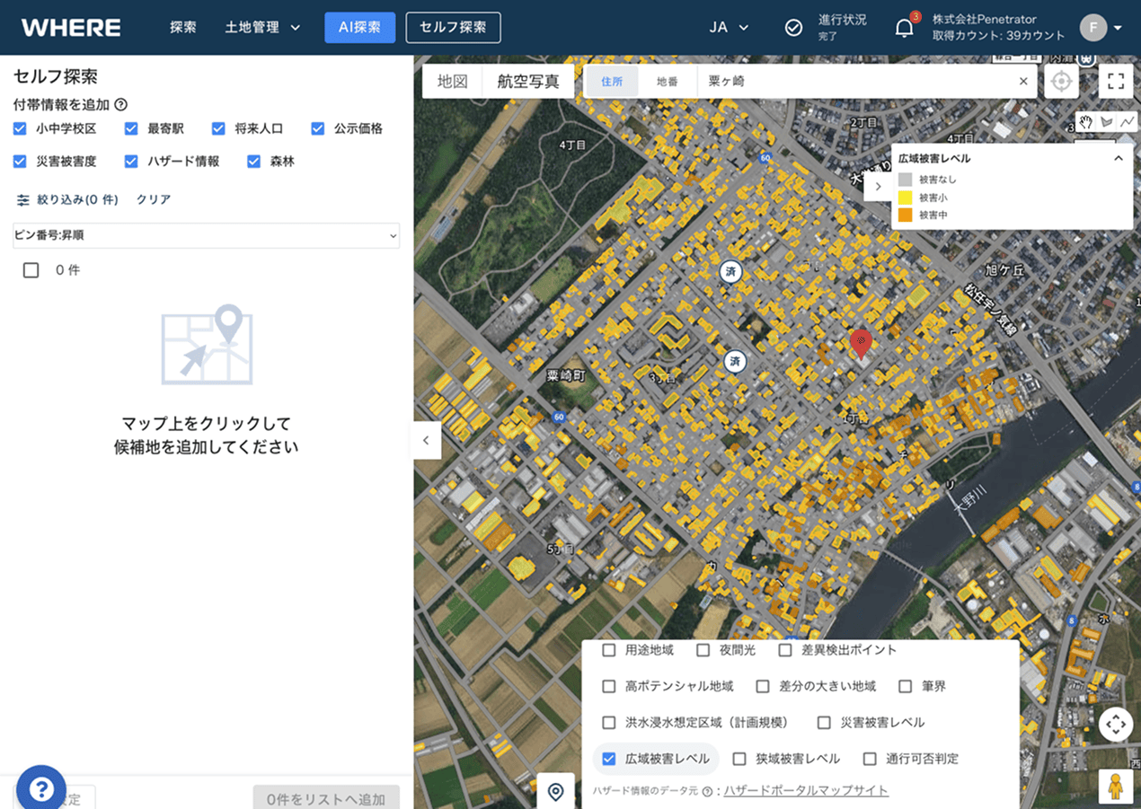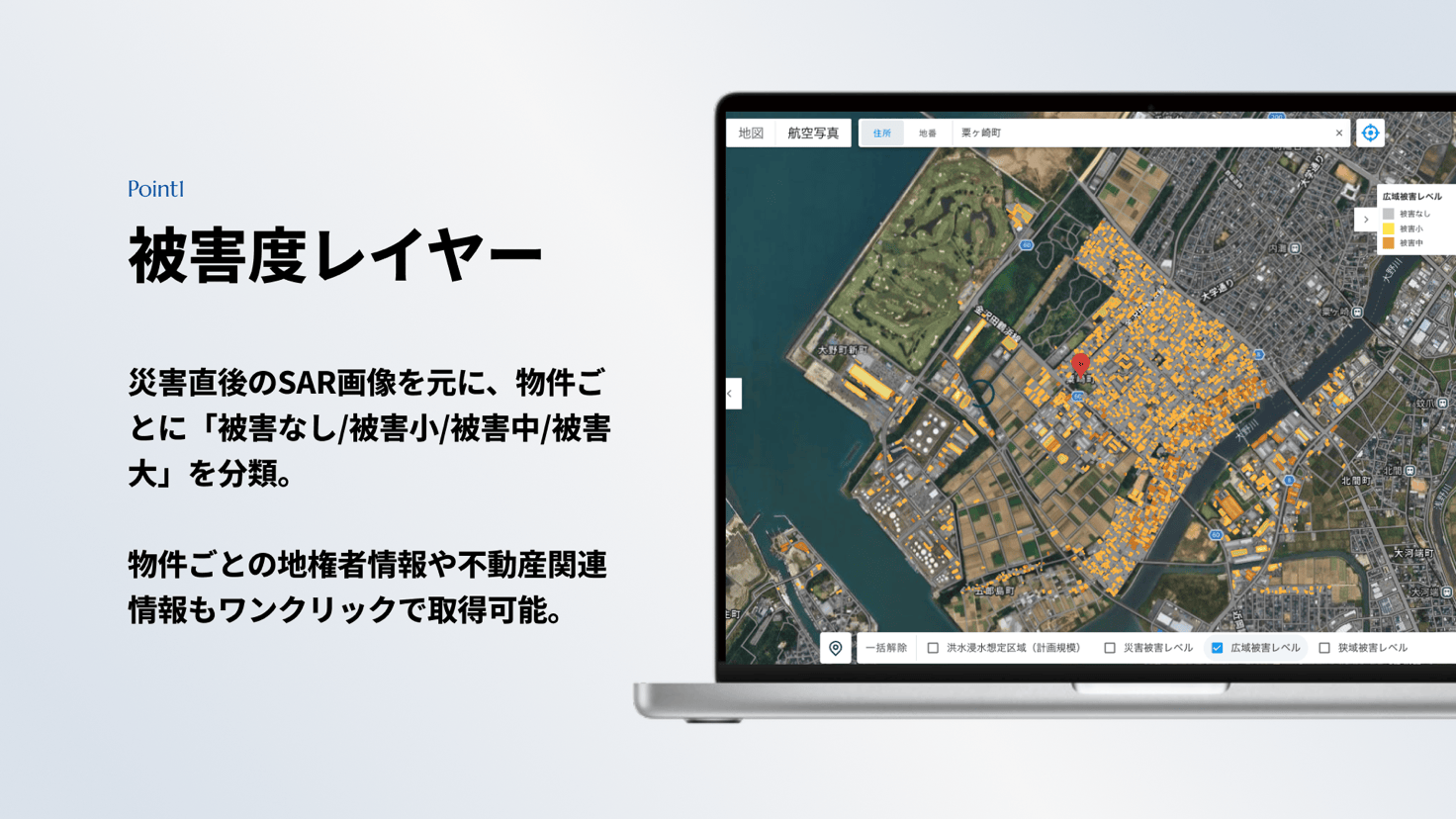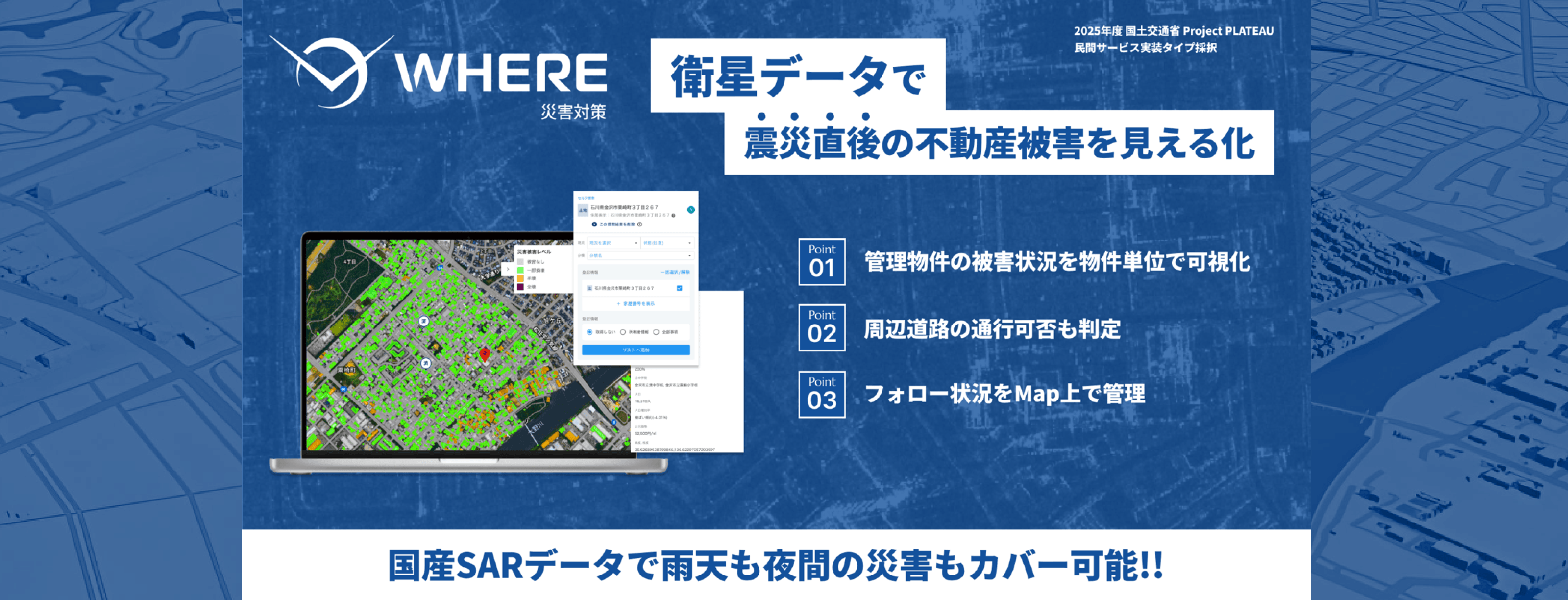 本プロジェクトでは、既存の不動産取引支援SaaS『WHERE』を基盤とし、発災直後のSARデータと3D都市モデルに格納された被災前の建物情報を照合・差分分析することで、被害状況を即座に可視化するシステムを開発する。
