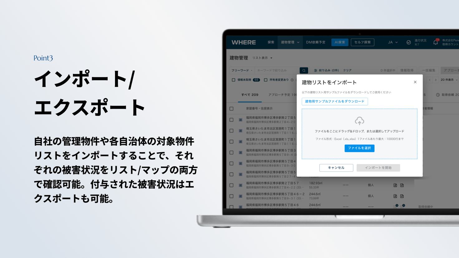 近年、地震をはじめとする自然災害が全国各地で頻発しており、大規模災害発生時における初動対応力の強化は、社会全体の喫緊の課題となっている。特に大規模震災の発生時には、地方公共団体および民間事業者は、罹災証明書の早期発行といった住民支援や事業継続(オーナーサポートや自社物件管理、各種生産管理、施工管理を想定)の観点から、被害状況を迅速かつ網羅的に把握することが強く求められる。