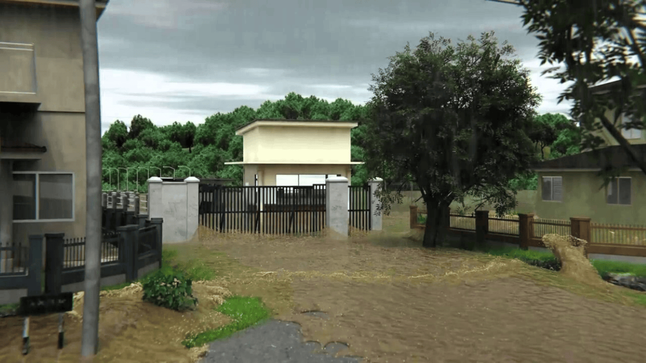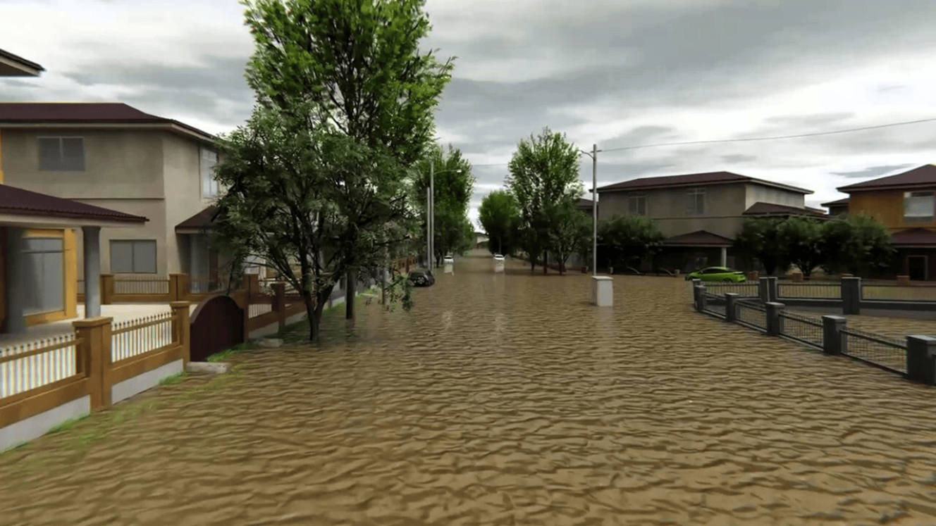 ビジュアルの高品質化および水害(洪水)リスクの可視化機能については、3DCGソフト「Blender」とそのアドオン機能を活用して実装されている。 まず、見た目補正処理および屋上構造ディテールアップにおいては、Blenderの「Geometry Nodes」や「Subdivision Surface」、「Particle System」といったモディファイア機能を組み合わせた独自のアルゴリズムを開発・適用した。これにより、低解像度なメッシュを滑らかにし、オープン地図データの色情報に基づいた建物の配色はもとより、水面や森林のマテリアルを自動的に高品質化・高密度化することで、フォトリアルな表現を実現している。 また、水害リスクを可視化する機能については、災害データに基づく水位変化や浸水範囲をBlender上の3D空間に反映させるアドオンとして実装されており、可視化結果を直感的に理解可能なmp4形式の動画ファイルとして出力する仕様となっている。
