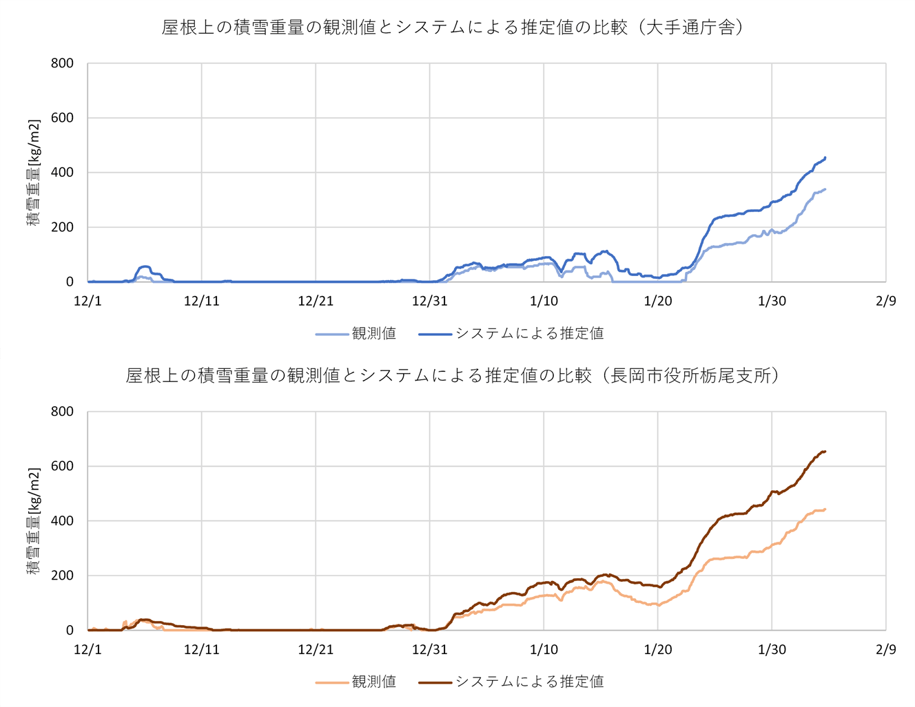 積雪重量の精度検証では、長岡市内の2つの建物で屋根雪の積雪重量を観測し、その観測値をシステムの予測値と比較することで精度を検証した。検証の結果、実証期間で積雪が最も大きかった1月末では、観測した屋根上の積雪重量に比べシステムで推定した積雪重量が30~40%程度過大に推定される結果となった。これは、積雪変質モデル(SNOWPACK)の計算で、建物からの熱によって融雪し流れ出る分の質量の考慮が不足していたことや、建物の形状による吹き溜まり、吹き払いの影響を考慮していないことが原因と考えられる。精度向上に当たっては、屋根上の積雪に適した積雪変質モデルのパラメータや計算上の設定の検討が必要となる。