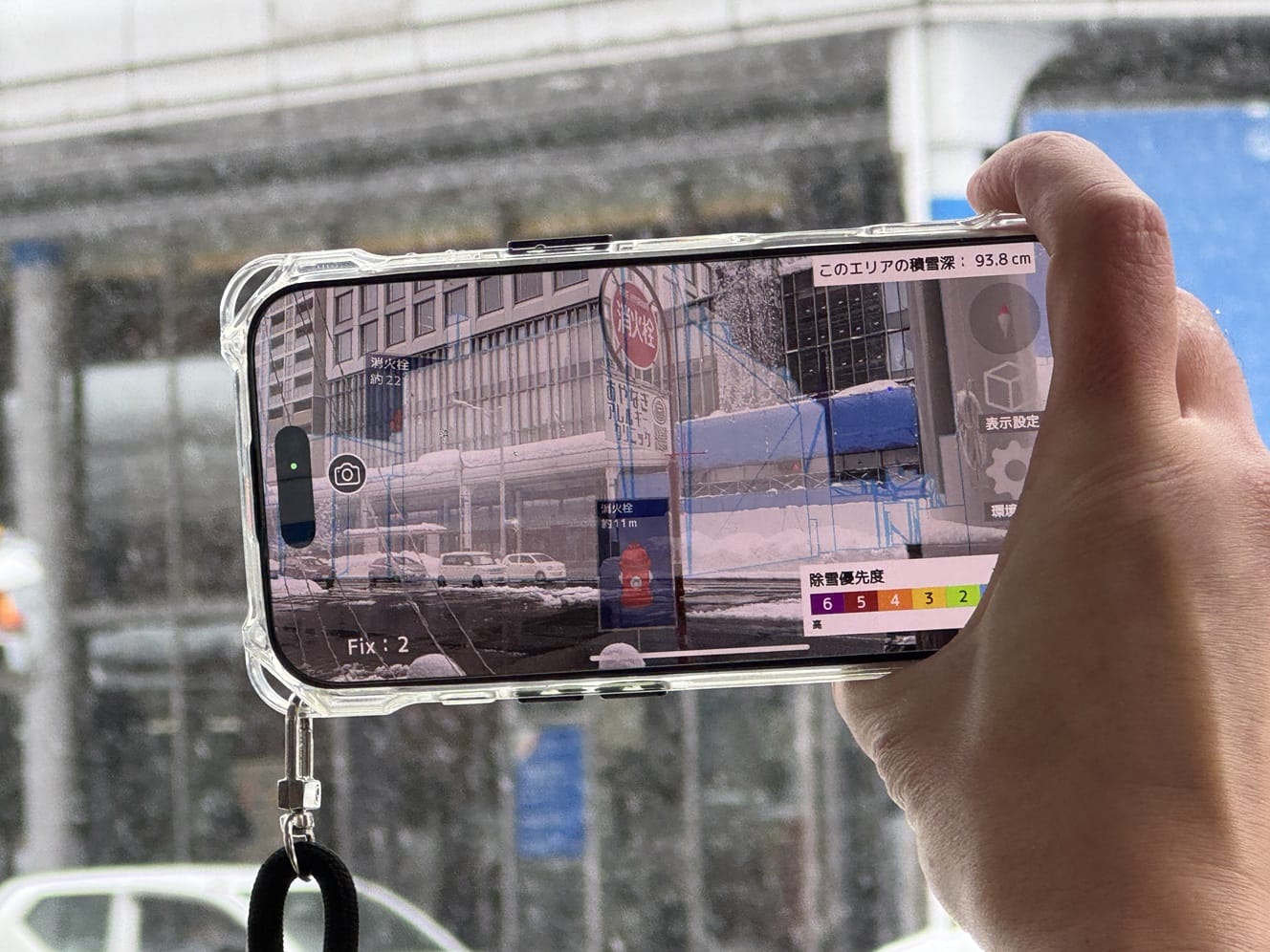 ⑥は音声入力によって被災状況の現地報告を記録し、表示する機能である。⑦は測位情報を基に、現在地の積雪深や建物ごとの除雪優先度をテキストや色分けされたワイヤーフレームで表示する機能である。なお、本プロジェクトでは除雪優先度算出システムで計算した除雪優先度と積雪深を、WebAPIを通じて取得し、ツール上に表示できるようにカスタマイズを行った。除雪優先度は、3D都市モデルで定義された建物ごとに優先度に応じて色分けされたワイヤーフレームで表示することにより、現地において各建物の優先度を直感的に判別できるようにした。積雪深は、除雪作業時の現地状況の把握を支援するためにツール上に表示できるようにした。