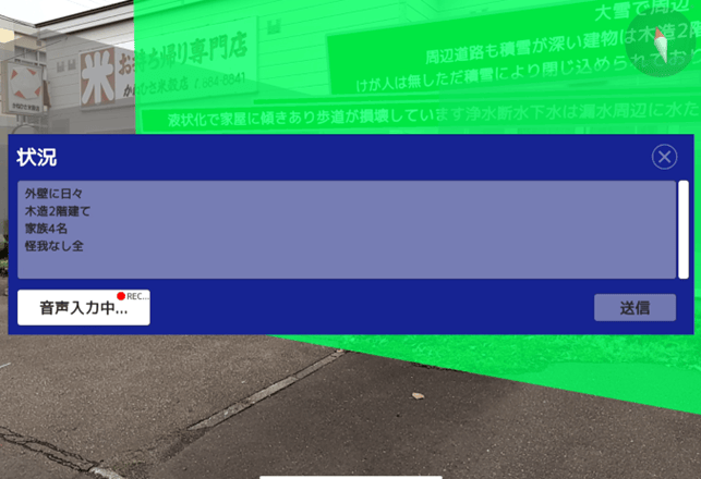 「⑥被災状況の現地報告・表示」機能は、スマートフォンの音声認識を用いて現地の状況を投稿できる機能として実装した。音声認識された内容はWebAPIを通じて除雪優先度算出システムにGeoJSON形式で投稿され、除雪優先度算出システムの地図上に表示される(機能④)。また、投稿された現地報告は除雪優先度算出システムからWebAPIを通じて他の被災現場支援ツールの端末とも共有され、ツール上にピンとして表示されるため、利用者間で現地の状況をリアルタイムに把握することが可能である。