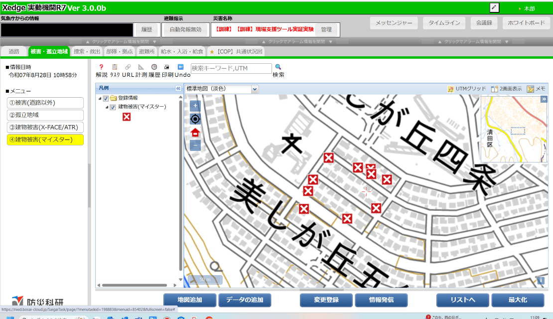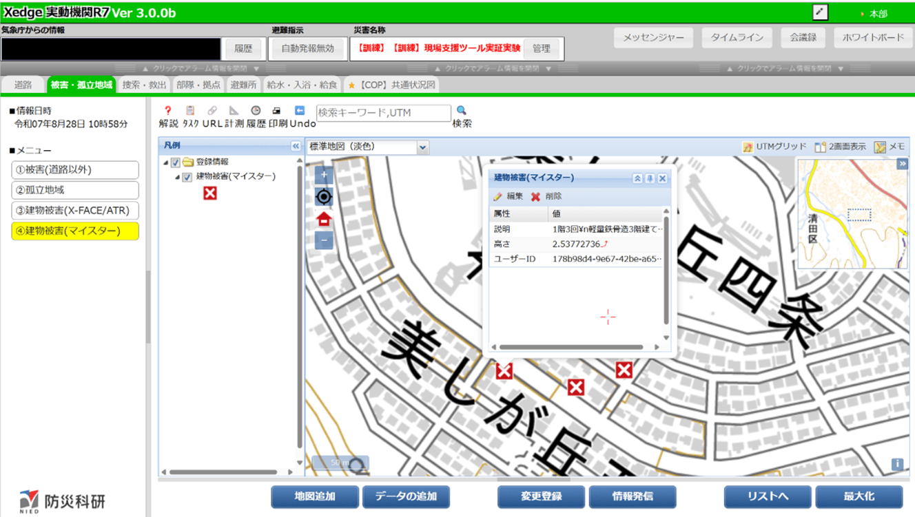 被災現場支援ツールでは、実証実験の参加者から災害現場での有効性、直感的な操作と音声入力による状況報告、3D都市モデルの視認性に高い評価を得られた。特に、被災状況の記録や情報共有に要する時間については、本ツールを用いることで従来の手法(紙様式)よりも大幅に時間が削減できることが確認できた。
