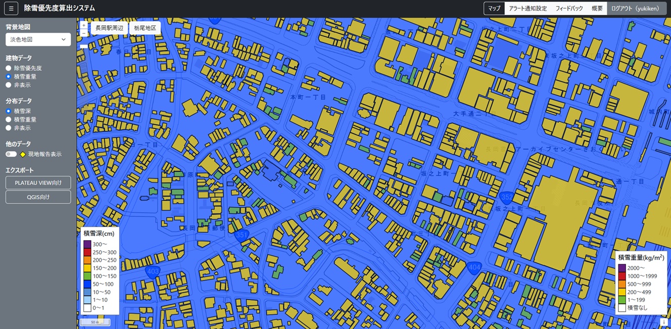 「除雪優先度算出システム」は、3D都市モデルと気象データ、積雪変質モデル(SNOWPACK)から個々の建物の積雪重量や除雪優先度を計算し、2次元の地図上に表示するシステムで、除雪計画の策定や除雪作業の補助等で雪国の住民や除雪の担い手の支援を行うものである。