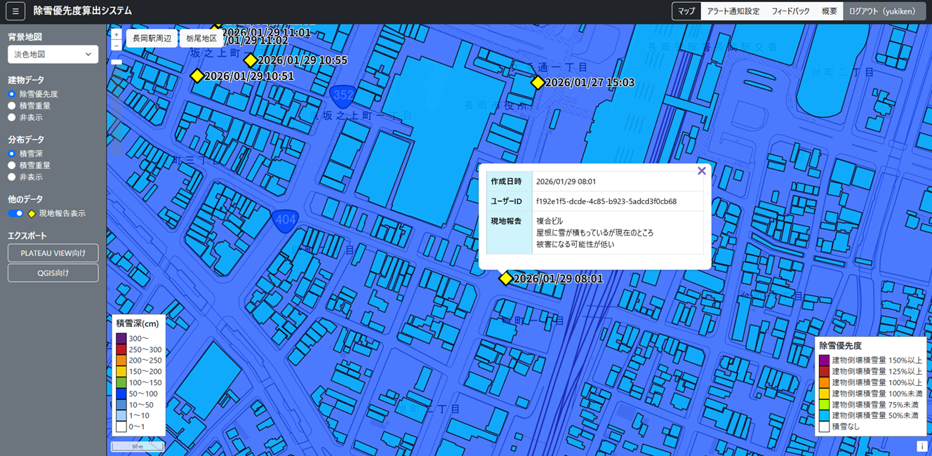 除雪優先度算出システムは、2次元の地図上で積雪深や積雪重量、除雪優先度等を閲覧可能なシステムで、「①地上の積雪深と積雪重量の算出・表示」、「②個々の建物の積雪重量と除雪優先度の算出・表示」、「③アラート通知」、「④現地報告情報の表示」の4機能で構成される。①は気象庁の気象データ(アメダス、解析雨量)を入力データとして積雪変質モデル(SNOWPACK)により1時間おきに地上の積雪深や積雪重量を計算し、その結果を250m格子のグリッドデータで表示する機能である。②は①で計算された地上の積雪重量と3D都市モデルから取得した建物形状や建築年に基づき、個々の建物の積雪重量と除雪優先度を計算し、建物毎に色分けで表示する機能である。③は事前登録した建物の除雪優先度が閾値を超えた場合に、最新の積雪重量や除雪優先度などの情報をメールでユーザーに通知する機能である。④は被災現場支援ツールの「⑥被災状況の現地報告、表示」機能(後述)で投稿された現地報告を地図上に表示する機能である。