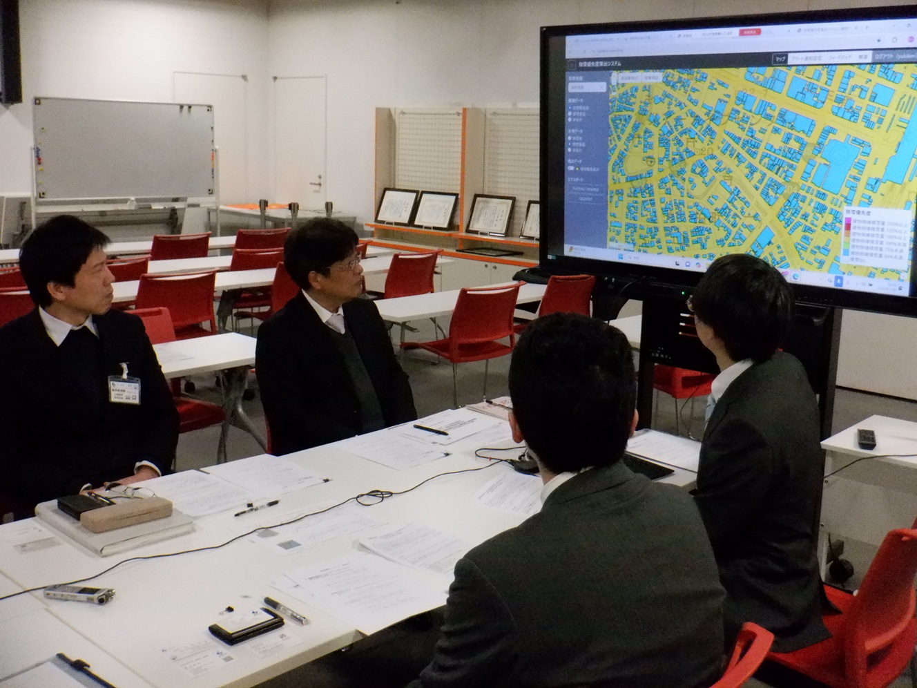 除雪優先度算出システムの有用性検証では、システムを試用頂いた実証の参加者の方々を対象に、システムの使いやすさ、除雪作業の計画や負担軽減に対しての有用性などについてヒアリングとアンケートで確認を行った。アンケートの結果、80%の参加者が除雪優先度算出システムの操作が分かりやすいと評価した。また、67%の参加者が、システムが除雪計画の策定に有用だと評価した。これは、建物毎に積雪重量や除雪優先度を色分けしたことによって、直感的に除雪の優先度が判断できるようになったためだと考えられる。一方で、除雪優先度の表現(建物倒壊積雪重量OO%)が分かりにくいとの意見もあり、「除雪が必要」、「除雪は不要」等のように利用者が直感的にわかりやすい表現で情報提供することが必要だと考えられる。