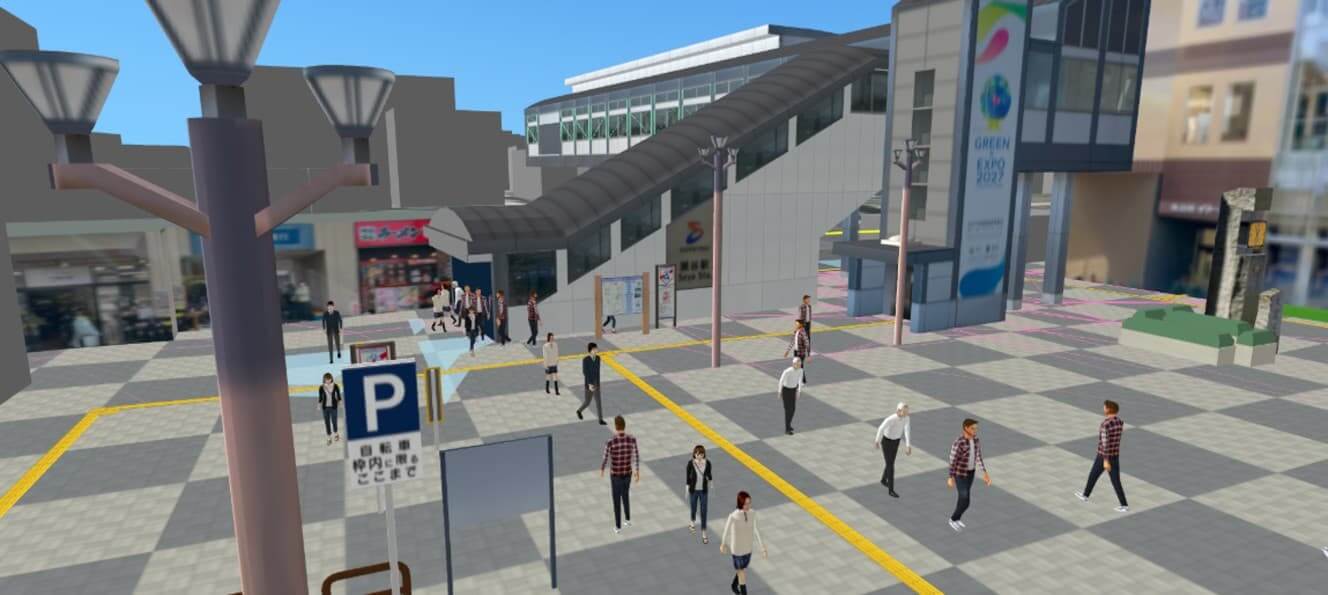 この仮想空間上で、公共交通機関の運行ダイヤと連携した人流シミュレーションを実施することで、歩行者の動きや群衆全体の流れ、混雑の発生箇所、待機列の長さを立体的かつ定量的に予測・可視化する。