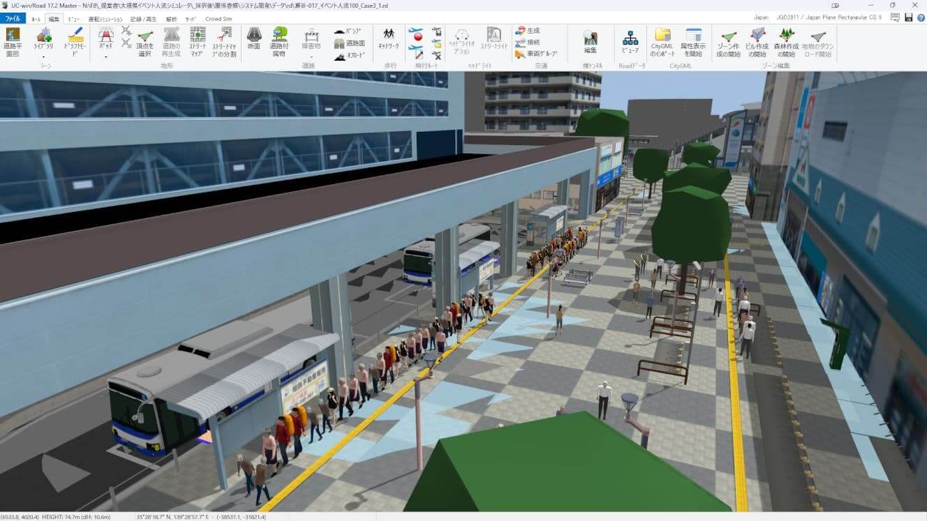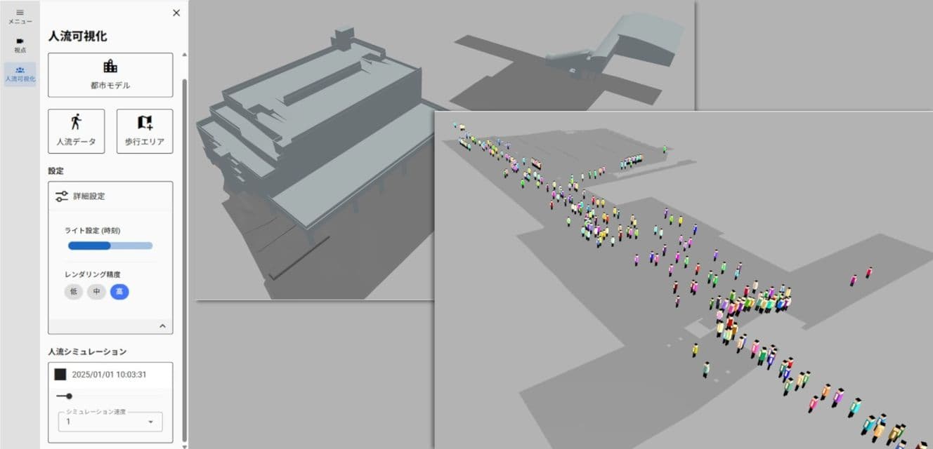 こうした状況を踏まえて、本プロジェクトでは2024年度に開発した「汎用的な人流シミュレーションシステム」を基盤として追加開発を実施する。駅舎内外を含む3D都市モデルの取り込みによる検証地のモデル自動生成機能に加え、人流・交通のパラメータ設定に基づく再現性の高いシミュレーション実行機能を実装。輸送計画の検討における有用性を検証するとともに、人流や混雑状況を3次元構造で可視化することによる関係者間での合意形成の促進も含めて、社会実装の可能性を検証する。