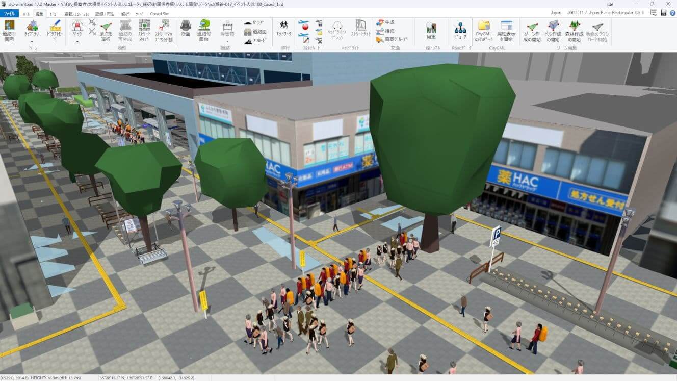 大規模イベントにおける輸送計画の策定を支援する人流シミュレータを開発。 3D都市モデルを活用し、歩行者の移動環境を立体的に再現することで、混雑の要因を精緻に分析し、実効性の高い計画策定を支援する。