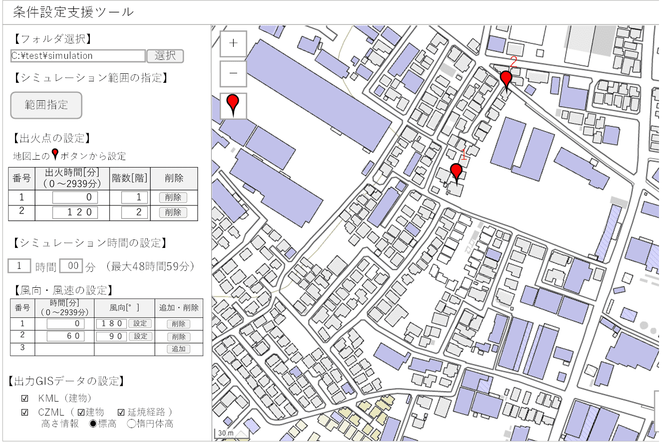②条件設定支援ツールは、地図表示を含めたグラフィカルユーザーインターフェース(GUI)を提供することで、シミュレーションの与条件設定とエンジン実行を支援する。地図表示には、Leafletを利用しており、XYZタイル(地理院タイル)形式の背景地図や、ファイル作成ツールで生成されたGeoJSON形式の建物データを画面上に表示する。地図上の建物をクリックして出火点の設定が可能である。また、風速・風向を時間で区切って設定することも可能である。ユーザーが設定した内容に基づき、シミュレーションエンジン用の各種入力ファイル(出火点ファイル、気象情報ファイルなど)を作成し、その情報をもとに国総研市街地延焼シミュレーションプログラムを活用して、シミュレーションを実行する。