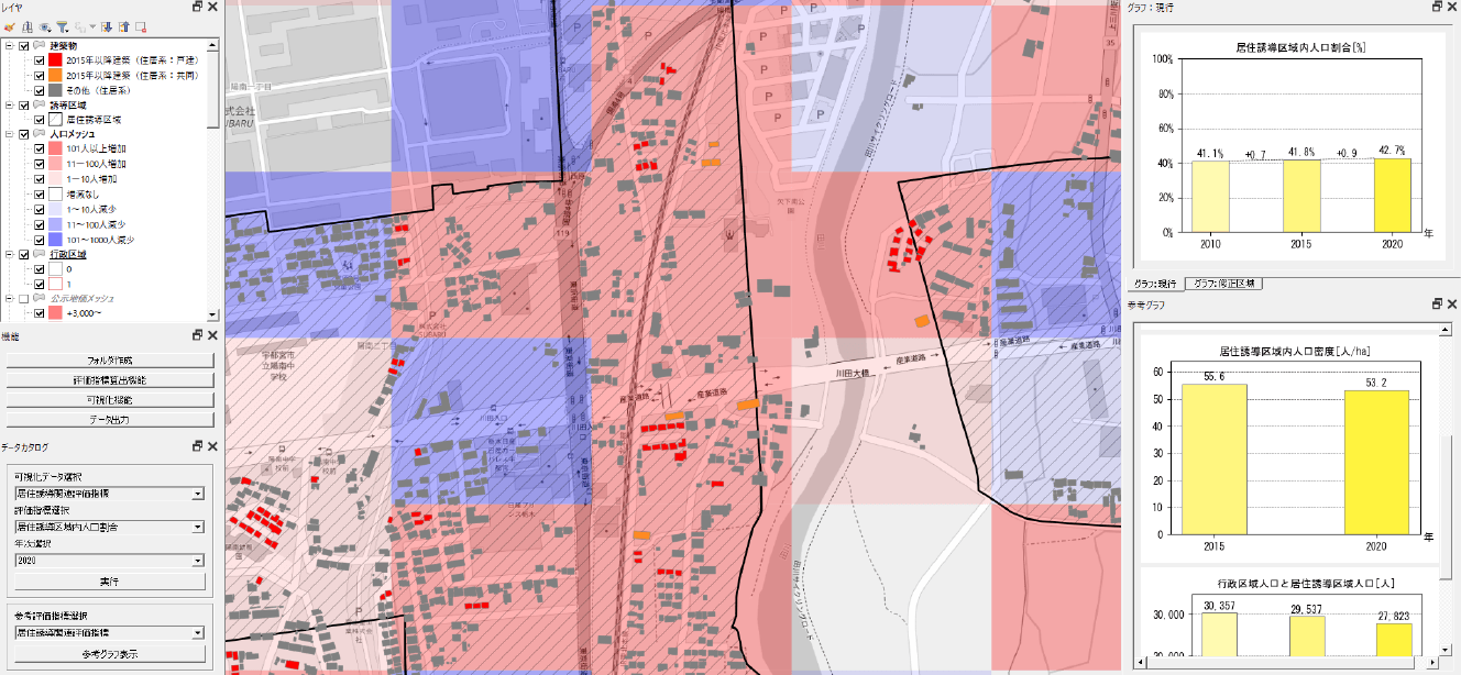 以上のとおり、本プロジェクトでは、昨年度開発のシステムを基盤としつつ、社会実装及び国の指針への適合を見据えた機能拡張を行うことで、立地適正化計画の検討業務や都市構造評価業務の内製化と現状分析・課題把握の精度高度化を支援する。