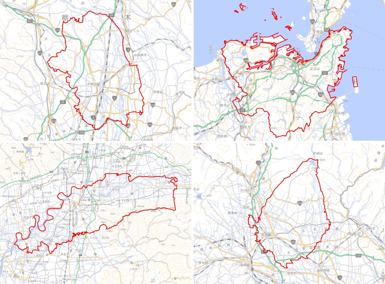 (左上:宇都宮市,右上:北九州市,左下:久留米市,右下:前橋市)