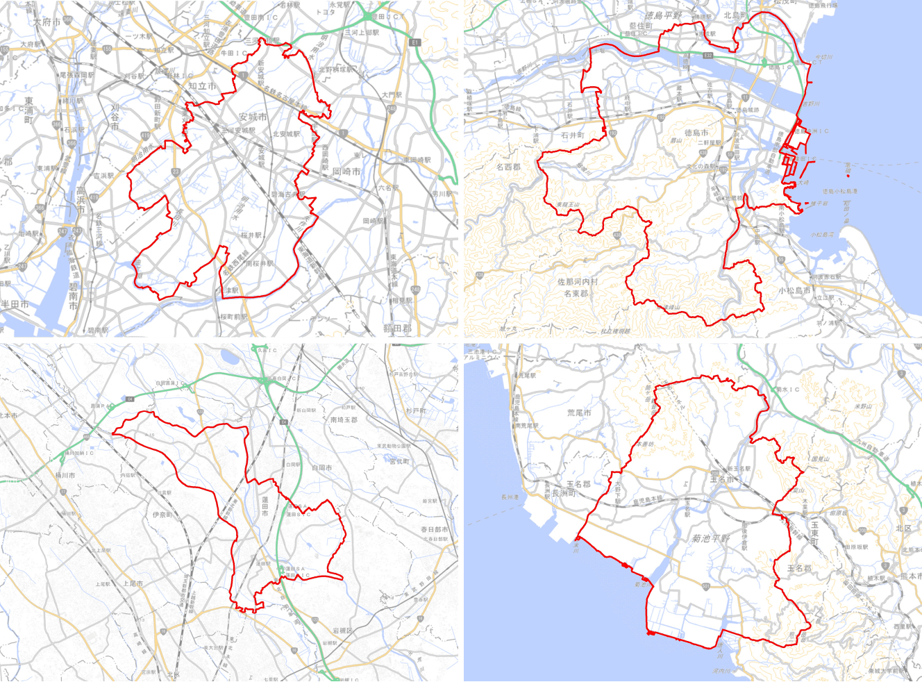 (左上:安城市,右上:徳島市,左下:蓮田市,右下:玉名市)