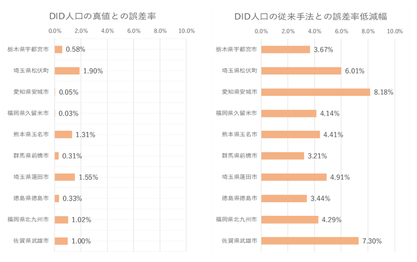 「圏域人口算出アルゴリズムの精度評価」については、本システムに実装した「延べ床面積を用いた建築物への人口貼り付けアルゴリズム」によって算出される圏域人口の精度向上効果について評価を行った。具体的には、国勢調査の全数調査に基づく把握精度が高い「DID人口」を真値とし、本システムで算出した建築物単位の人口データに基づく数値との誤差率や、従来のメッシュ単位の人口データに基づく数値の誤差率と比較した誤差低減幅を基に評価を行った。