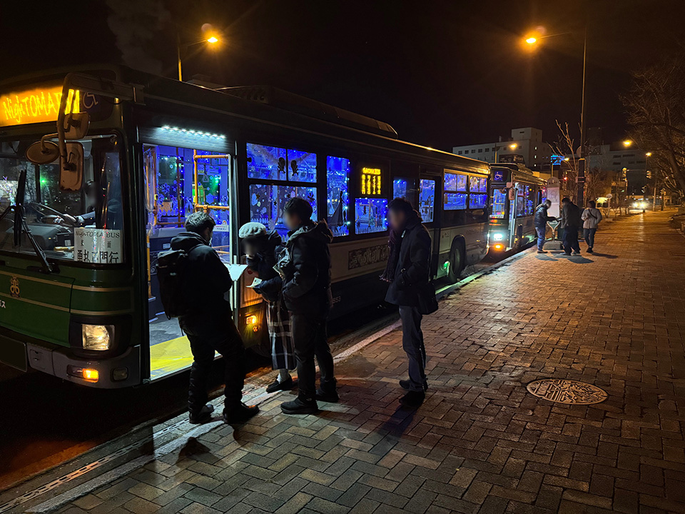 夜間にタクシーが不足する問題を解決するため、特に深刻であった忘年会シーズンの金・土曜日の夜間に、苫小牧市内のまちなかから、東方面と西方面のそれぞれに、1日計4便の路線バス「ナイとまバス」の運行を実施した。