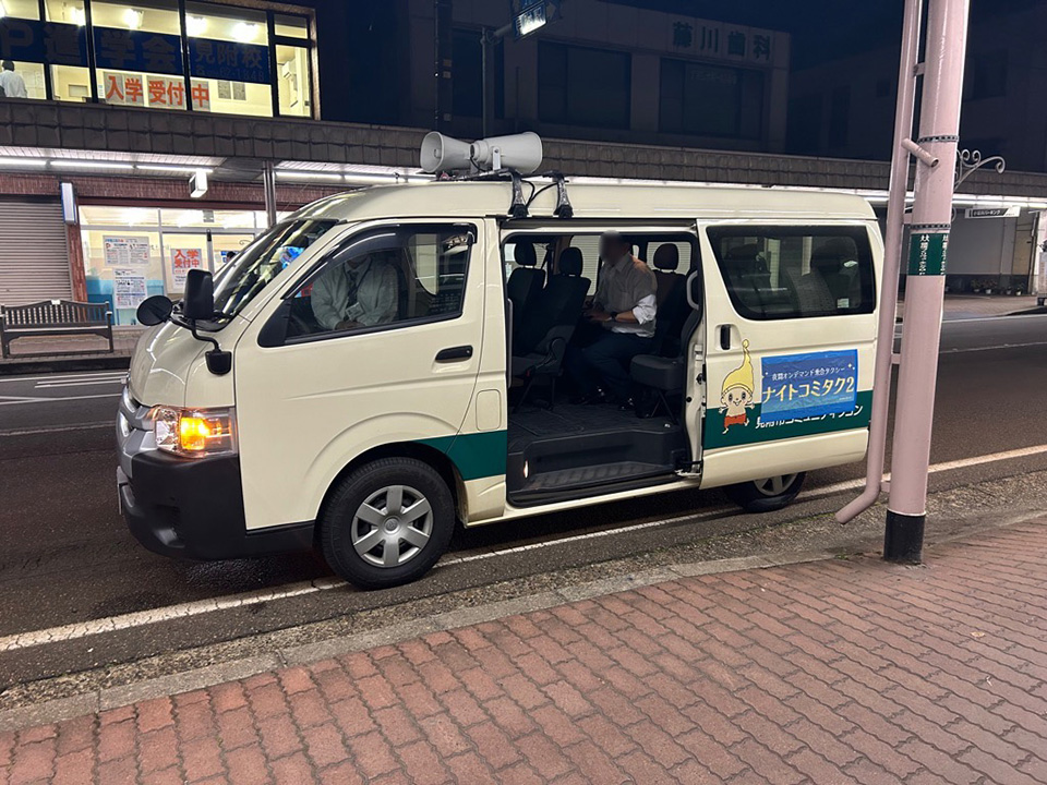夜間の移動需要に対して公共交通サービスの供給不足であったため、週末(金・土曜)の夜間に、飲食店が多いエリアを出発地とする市内全域で降車可能なオンデマンド乗合タクシー「ナイトコミタク」の運行を実施した。