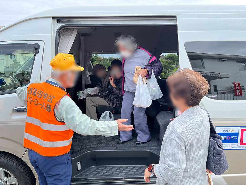 住民・近隣の社会福祉事業所・高齢者支援センターの連携により、社会福祉事業所の遊休時間帯の車両、運転手を活用した無料巡回バスを導入し、坂の多い住宅地における、高齢者の買い物等移動の足を確保。