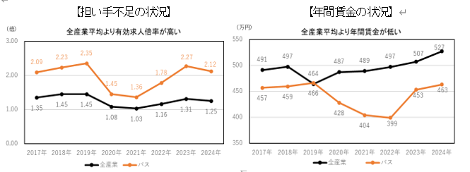 貸切バス運転者の確保は喫緊の課題ですが、運転者の平均給与額は全産業平均給与額を下回る状況が続いています。 運転者の担い手不足の解消には、賃金水準を全産業平均給与額まで引き上げることが不可欠であり、 その原資を確保するため、令和7年9月26日付けで新たな運賃・料金額を公示します。 |