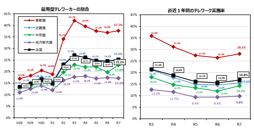 令和7年度調査における雇用型テレワーカー ※1の割合は、全国で25.2%(0.6ポイント増)、直近1年間のテレワーク実施率※2は、全国で16.8%(1.2ポイント増)となりました。