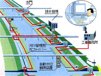 21世紀に向けた河川整備における基本施策の実現及びコストの縮減等を図るため、関係機関との連携を進めつつ、技術開発を推進。 ◎第2次河川技術開発五箇年計画の策定 災害を防ぎ、豊かな生活環境を創造するため、平成11年度を初年度とする第二次河川技術開発五箇年計画に基づき、水文観測の高度化と合理化、環境影響の低減技術等の河川・ダム・砂防・海岸等に係わる技術開発を大学や民間との連携を積極的に行いながら、一層推進。 【新技術の例 光ファイバを活用した河川管理】 |