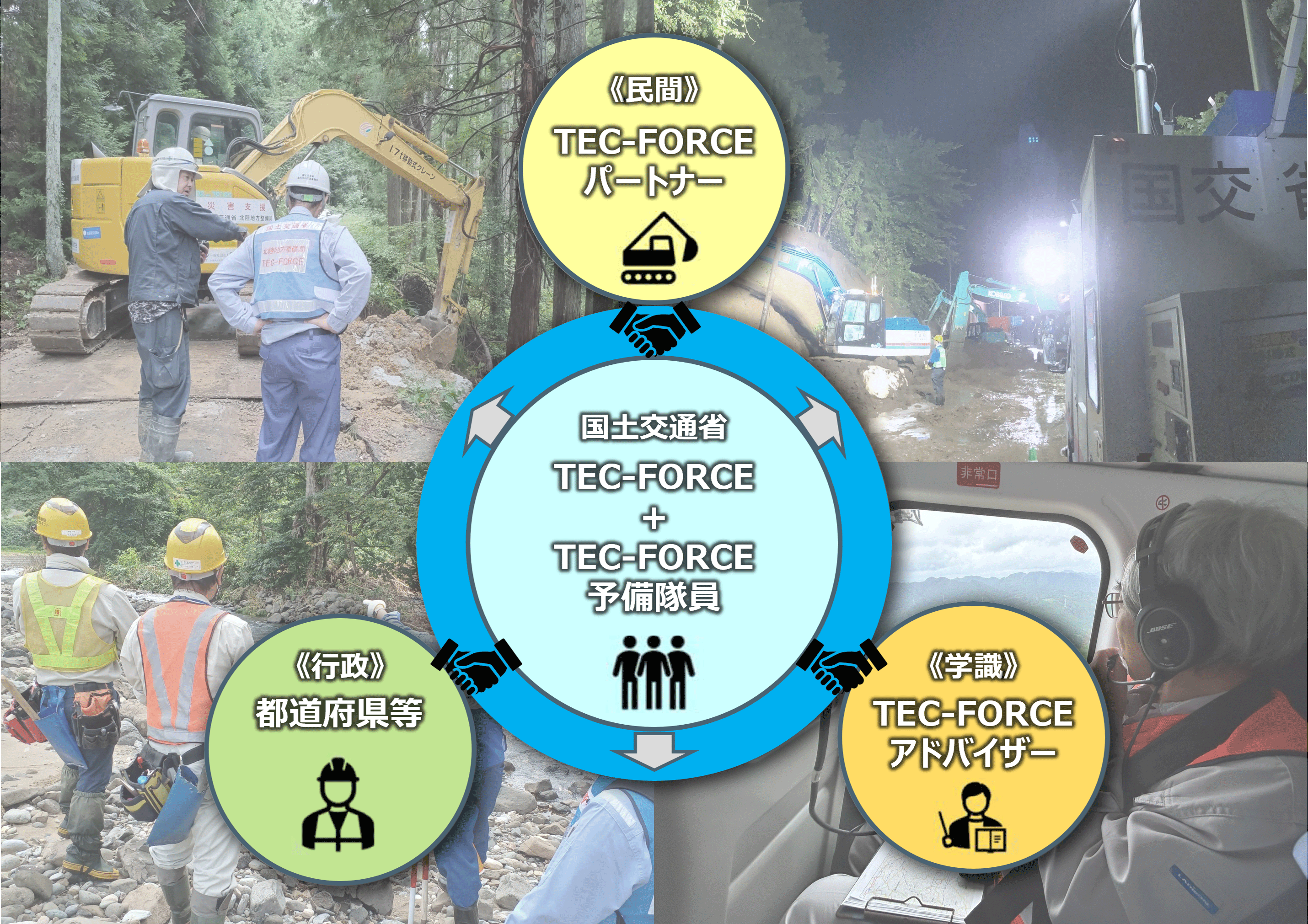 令和7年6月4日の「災害対策基本法等の一部を改正する法律」の公布・一部施行を受け、緊急災害対策派遣隊(TEC-FORCE)の増強と行政機関・民間企業・学識者などの専門性を持った多様な主体との更なる連携強化により、被災自治体への新たな応援体制を構築していきます。