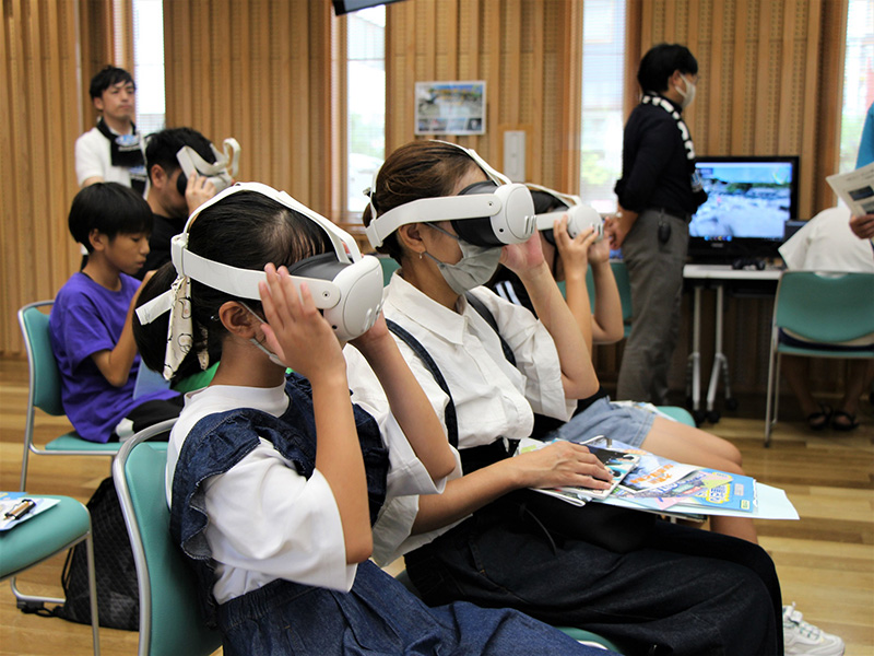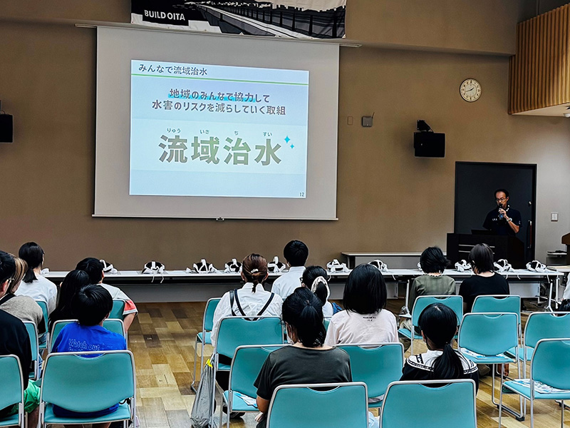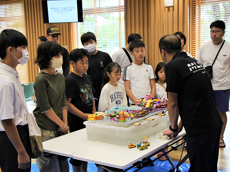 おしごと教室の講座のひとつである「防災・減災」は、大分大学 減災・復興デザイン教育研究センター・国土交通省九州地方整備局大分河川国道事務所・大分市管工事協同組合が協同で実施しており、山地やダム・堤防・遊水池・放水路等をレゴブロックで表現した河川模型による氾濫実験や、災害を疑似体験できる防災VR体験を通して、防災・減災について学びます。