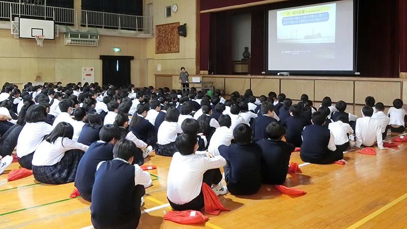 「川と寄り添うまちの自然災害を考える」ことで、「自助・共助・公助」を理解し、中学生が地域の防災で担える役割があることと行動する大切さを伝えました。