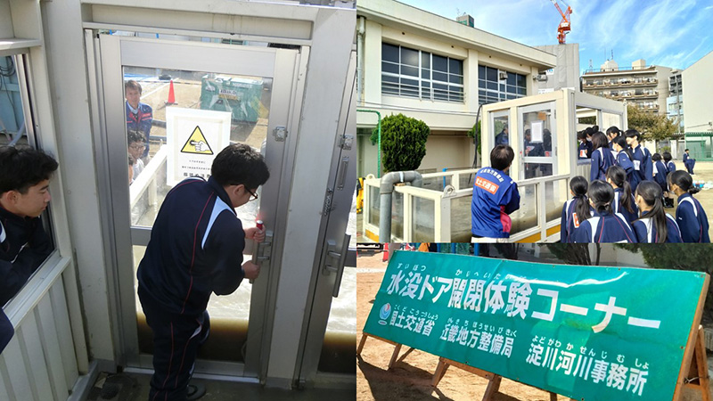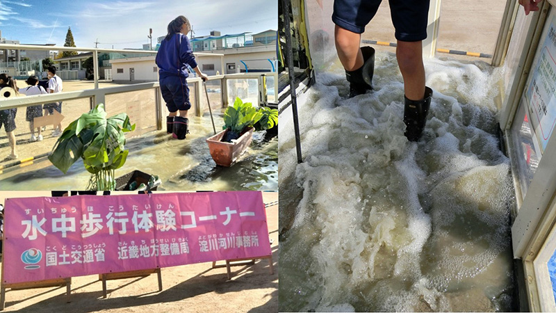 座学で「地域の水害リスク」を学び、洪水や高潮、自身による津波などの影響が起こりうる地域である事を理解した上で、国土交通省の設備を使用した浸水地歩行体験(浸水地の危険性を知り、リスク回避を促す体験)や、水没ドア体験(水圧により脱出が困難になる事態を想定した体験)など、様々な体験を通して水害時のリスクについて学ぶものです。