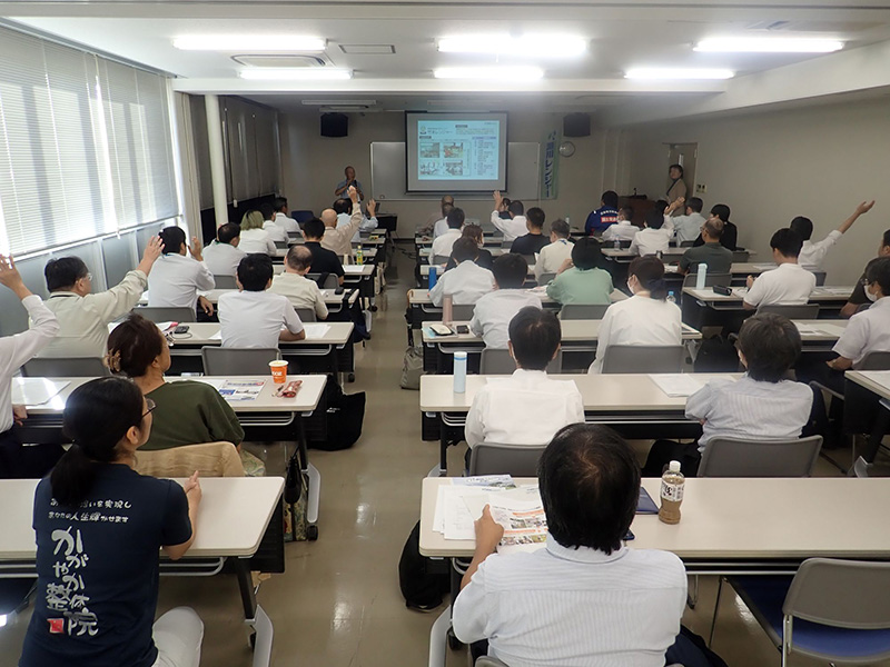 「地域連携グループ連絡会」とは、河川レンジャーの活動状況や情報共有と地域連携の取り組みについて地域の有識者や沿川自治体に情報共有を行うため開催するものです。今回は、河川レンジャーが進める「流域治水」の取り組みである【浸水地歩行】と【マイ・タイムライン作成】を約40名の参加者へ体験してもらいました。