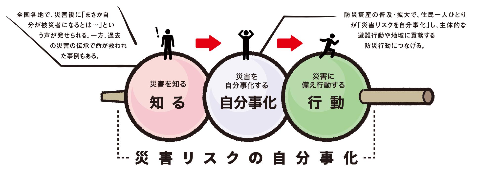 何かを認識する、知ることと、実際に行動することの間には少しギャップがあります。そのギャップを埋め、実際の行動に結びついていく心の醸成、深化の過程が【自分事化】です。vol.14のインタビューでは、伝承碑の存在によって、子どものころからそこまで水があふれてくることを意識していたというお話もありました。