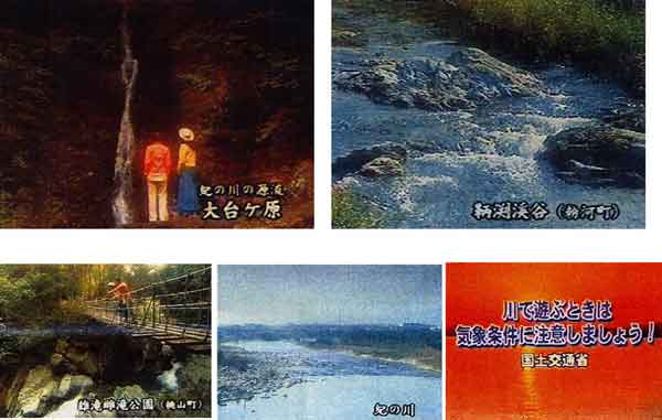 紀の川水系紀の川において、川でのキャンプシーズンとなる7月末から8月にかけて、川での事故を防止するためのキャンペーンCMをラジオ放送したものである。 放送された内容は、和歌山県のAMラジオにて、以下の水難事故防止ラジオコマーシャルを1日に2〜4回放送した。 1)(20秒バージョン) AN)夏はキャンプのシーズンです。 でも、河原でのキャンプは雨が降ると、 水位が急激に上昇し川に取り残される危険があります。 川でキャンプをするときは、気象情報に注意して、 雨が降ったりダムの警報が鳴ったら 速やかに安全なところへ避難するようにしましょう。 建設省和歌山工事事務所からでした。 2)(30秒バージョン) AN)いま、海や山ではキャンプが真っ盛り。 ここで問題。(効果音) 河原でのキャンプ中、小雨くらいなら降っても大丈夫 ○か×か。 B) ○ AN)(ブー)、正解は×。 山の天気は変わりやすく、また、キャンプ場所で雨が降っていなくても 上流が強く降ったりすれば、急激に増水し、 川に取り残される危険があります。 川でキャンプをするときは、気象情報をよく注意し、 ダムの警報が鳴ったら速やかに安全なところに避難しましょう。 建設省和歌山工事事務所からでした。 |