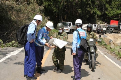 河野宮崎県知事が隊員を激励(宮崎県西臼杵支庁) 南阿蘇村における被害状況調査(道路班)