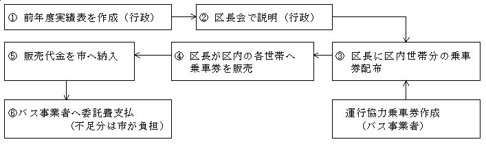 A住民負担のしくみ ・住民の負担は、現在年4,000円/世帯。対象となる3路線の沿線世帯は、運行協力乗車券(金額式乗車券)を購入することによって負担する。この運行協力乗車券は、路線ごとに発行されるものであり、当該路線以外の区間での使用はできない。 ・運行協力乗車券の販売に際しては、生活保護世帯など徴収対象外の判断は、区長の一任によっている。 ・乗車券の購入(料金徴収)方法は図2-3に示すとおりである。 | |||||||||||||||||||||||||||||||||||||||||