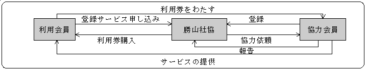 - 利用希望者は、予め電話で申し込み予約し、社会福祉協議会は、利用会員からのサービス申し込みに対して、協力会員の派遣をコーディネートする。現在の協力会員数は約40名である。なお、協力会員は、勝山市外の者も対象となる。