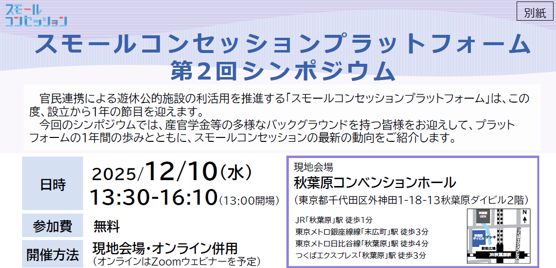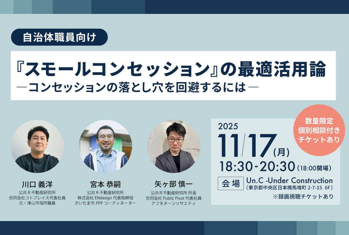【自治体職員向けイベント】『スモールコンセッション』の最適活用論 ―コンセッションの落とし穴を回避するには―公共R不動産(株式会社オープン・エー) Un.C -Under Construction(東京都中央区日本橋馬喰町2-7-15 6F) 令和7年11月上旬予定 サウンディング奈良市 全国 令和7年10月14日~ 令和7年11月7日 サウンディング下田市 全国 令和7年11月5日~ 令和7年11月7日 サウンディング鹿児島県 全国(鹿児島県及びオンライン) 令和7年10月21日、22日、24日
