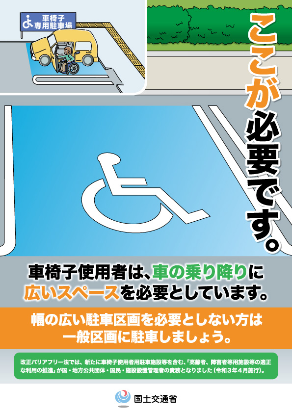 国土交通省では、車椅子使用者用駐車施設等の適正利用を推進するためのポスター・チラシ等を作成し、広報啓発に取り組んでいます。