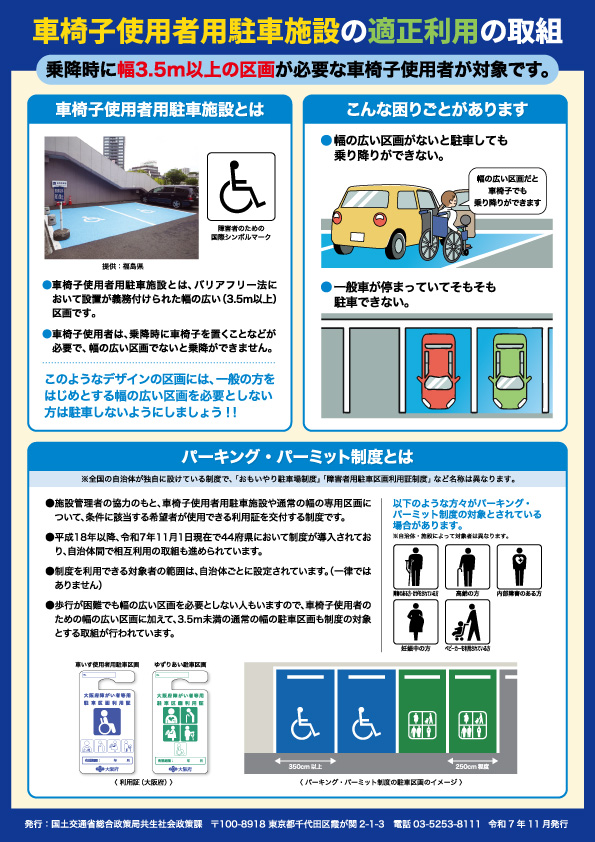 このため、国土交通省では、車椅子使用者用駐車施設等の適正利用に関するガイドラインの策定や、全国の自治体におけるパーキング・パーミット制度の導入促進、ポスター・チラシ等による広報啓発などに取り組んでいます。