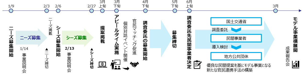 ○ 官民双方からのニーズ・シーズの提案をそれぞれがアピールし、ニーズとシーズをマッチングさせるイベントを経て、国土交通省では、新たな官民連携手法に関する調査委託の公募を行い、調査委託先となる民間事業者及び導入検討対象の地方公共団体を選定した後、導入検討を行う予定です。