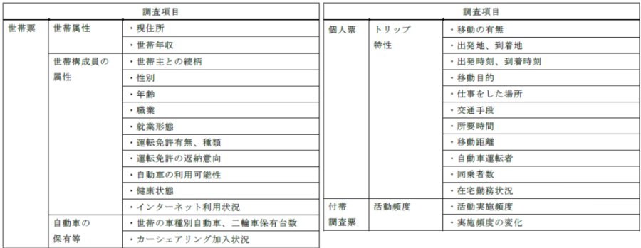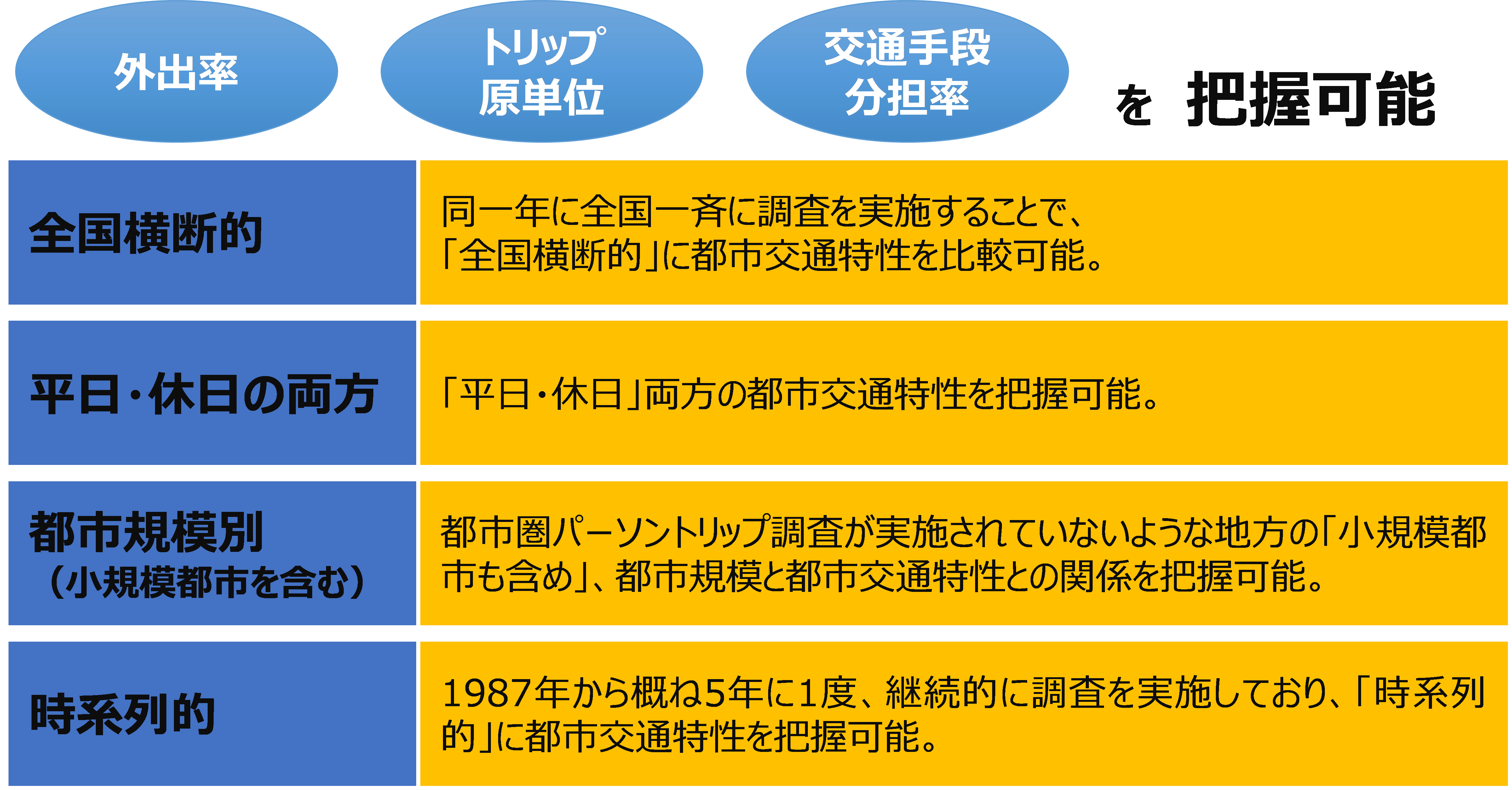 全国の平日・休日の都市交通特性を都市特性・地区特性等の関連において把握し、社会情勢の変化や地域特性に応じた都市交通計画・施策を検討するための基礎資料を得ることを目的としています。